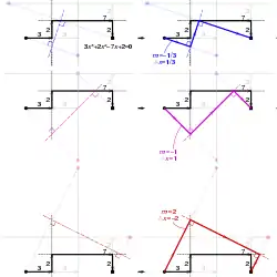 In this example with 3x3+2x2−7x+2, the polynomial's line segments are first drawn on a sheet of paper (black). Lines passing through reflections of the start and end points in the second and third segments, respectively (faint circle and square), and parallel to the them (grey lines) are drawn.