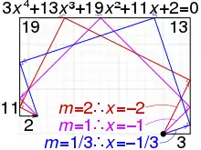 A line is then launched from the origin at some angle θ, reflected off of each line segment at a right angle (not necessarily the "natural" angle of reflection), and refracted at a right angle through the line through each segment (including a line for the zero coefficients) when the angled path does not hit the line segment on that line.[4] The vertical and horizontal lines are reflected off or refracted through in the following sequence: the line containing the segment corresponding to the coefficient of then of etc. Choosing θ so that the path lands on the terminus, the negative of the tangent of θ is a root of this polynomial. For every real zero of the polynomial there will be one unique initial angle and path that will land on the terminus. A quadratic with two real roots, for example, will have exactly two angles that satisfy the above conditions.