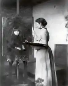 In 1884 Perry began her formal artistic training with the portrait painter Alfred Quinton Collins.[2] Collins had studied at the Académie Julian in Paris under the guidance of Léon Bonnat.[12] Perry's The Beginner, c. 1885–86, represents the first work she completed under formal guidance. The Beginner echoes Collins’ influences with the sitter's serious gaze, dark background, and emphasis on dramatic lighting.[11]