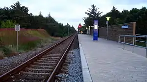The halt is located on the Hirtshals Line from Hirtshals to Hjørring. It opened in 1940, was closed again in 1956, but reopened in the 1990s.[3][4] The train services are currently operated by the railway company Nordjyske Jernbaner which run frequent local train services between Hirtshals and Hjørring with onward connections from Hjørring to the rest of Denmark.[2]
