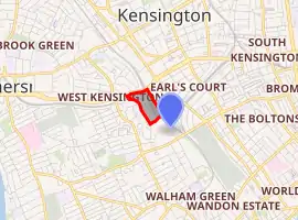 In 2008, with the election of a Conservative Mayor of London, plans were drawn up for the redevelopment of the Earls Court Exhibition Centre site, including Lillie Bridge depot and other surrounding land, covering an area of 44 acres (18 ha).[25] Outline planning consent was granted to the redevelopment "masterplan" by the adjacent Conservative-controlled local authorities in November 2013, and Transport for London made an agreement with Capital and Counties PLC (Capco) to carry out the redevelopment of Earls Court exhibition halls 1 and 2, including Lillie Bridge Depot, as a joint venture, ECPL (Earls Court Properties Limited). Transport for London had been looking at options for the depot since 2010, and had reached the conclusion that the workshops could be relocated to Acton Works, with the Transplant maintenance facilities moving to Ruislip depot. However, there was still a need for stabling of trains at the site, and the intention is to construct a low-level box beneath the new buildings for this purpose.[26] Ashfield House, which has provided office accommodation on the northern edge of the depot site, and since 2010 contained a realistic mock-up of a tube station for staff training purposes, known as West Ashfield tube station, is also to be vacated, with staff redeployed elsewhere, so that the building can be demolished.[27][26] The consequent reconfiguration of Acton Works may require the Emergency Response Unit to relocate from there to another site.[28]