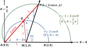 The construction of the outer loop of reveals its angle trisection properties.[5] The outer loop exists on the interval . Here, we examine the trisectrix property of the portion of the outer loop above the polar axis, i.e., defined on the interval .