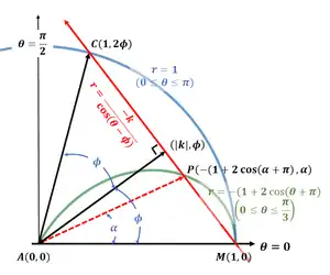 - First, note that polar equation is a circle with radius , center on the polar axis, and has a diameter that is tangent to the line at the pole . Denote the diameter containing the pole as , where is at .