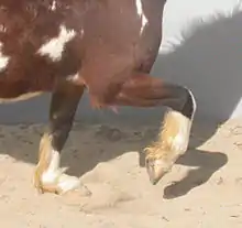 There are numerous issues that can occur with horses' legs that may not necessarily cause lameness. Stocking up is an issue that occurs in horses that are held in stalls for multiple days after periods of activity. Fluid collects in the lower legs, producing swelling and often stiffness. Although it does not usually cause lameness or other problems, prolonged periods of stocking up can lead to other skin issues. Older horses and horse with heavy muscling are more prone to this condition.[28] A shoe boil is an injury that occurs when there is trauma to the bursal sac of the elbow, causing inflammation and swelling. Multiple occurrences can cause a cosmetic sore and scar tissue, called a capped elbow, or infections. Shoe boils generally occur when a horse hits its elbow with a hoof or shoe when lying down.[29] Windpuffs, or swelling to the back of the fetlock caused by inflammation of the sheaths of the deep digital flexor tendon, appear most often in the rear legs. Soft and fluid-filled, the swelling may initially be accompanied by heat and pain, but can remain long after the initial injury has healed without accompanying lameness. Repeated injuries to the tendon sheath, often caused by excessive training or work on hard surfaces, can cause larger problems and lameness.[30]