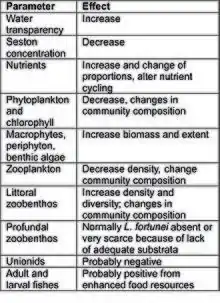 The golden mussel is a filter-feeder. Adult individuals process around 1 liter of water every 10 hours,[32] retaining organic particles, including phytoplankton and zooplankton, and egesting or rejecting unwanted materials in mucous strands that settle on the bottom. The effects of this process on the water column include the decrease of suspended particles, water column primary production, and the concomitant increase in water transparency. which in turn enhances the growth of submerged macrophytes.[32] Further, nutrient (ammonia, nitrate, phosphate) concentrations in the water are increased, favoring the growth of often toxic cyanobacteria.[33] Bottom deposits and the sediments retained among the mussels are enriched with organic matter. Benthic organisms and those that feed on detritus in general, including many fish species, benefit from this additional source of energy. Benthic invertebrates, in particular, are usually more diverse and abundant in mussel beds than elsewhere.[34]