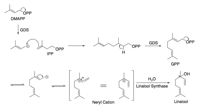 The biosynthesis of linalool in higher plants starts at the condensation of dimethylallyl diphosphate (DMAPP) and isopentenyl diphosphate (IPP) to form geranyl pyrophosphate (GPP).[11] With the aid of linalool synthase (LIS), water attacks to form the chiral center.[12][11] LIS appears to show a limonene synthase-type catalysis through a simplified "metal-cofactor-binding domain [where the majority] of the residues involved in substrate...binding [are] in the C-terminal part of the protein" suggesting stereoselectivity and the reasoning behind why some plants have varying levels of each enantiomer.[13][14]