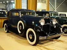 The Lincoln K series was split in 1932 into two lines, the V8 carryover Model KA and the new V12-powered Model KB. The V8 car reverted to a 136 in (3454 mm) wheelbase, though engine output was pushed to 125 hp (93 kW). The KB, on the other hand, featured the marque's new L-head V12 engine. The 447.9 cuin (7.3 L) 65° L-head unit produced 150 hp (112 kW).[4] Both series featured a new grille with less of a surround, vent doors rather than vertical louvers on the sides of the hood, a parking light on top of each front fender, and 18 inch wire wheels. The Lincoln V-12 competed directly with cross town rival Cadillac V-12 introduced earlier in 1930, and it joined a select group of 1930s cars with multicylinder engines, namely those manufactured by Franklin, Hispano-Suiza, Horch, Lagonda, Maybach, Packard, Rolls-Royce, Tatra, Voisin, Walter, and Marmon. The Victoria Coupe was offered as both a steel roof and a convertible, and the coupe was the inspiration for the smaller 1932 Ford Victoria coupe, also offered with a V8 engine but a more affordable price.[5] The Lincoln Victoria coupe, first introduced in limited numbers in 1929,[6] also competed with the Packard Light Eight Victoria coupe also in 1932.