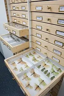 The only university entomology collection in New Zealand, the collection contains over 250,000 pinned insect specimens, including over 70 holotypes and a large collection of specimens in ethanol.[3][8] It is one of the largest and most diverse insect collections in New Zealand, smaller than the National Arthropod Collection at Landcare Research and comparable in size to holdings at Te Papa.[8] The collection is strongest in South Island species, especially from the West Coast and Southern Alps, with collections from the Chatham Islands, Three Kings, and subantarctic islands.[3] Taxonomically, its strengths are:[3][8]