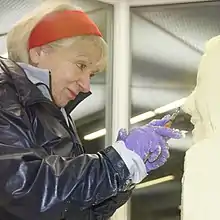 The butter carving booth is one of the most popular exhibits at the state fair. The princess's family and friends stand around the rotating cooler as Christensen carves her sculpture.[4] While she carves their faces, the princesses hold a microphone and answers question from the public about life on a dairy farm. In between interviews, Christensen talks to the princesses about boys, her children and her grandchildren.[5] She likes working with butter as a medium because it's forgiving and can be "squished" into any form. It's also an attractive, eye-catching surface.[7] She said the salted butter is much nicer to carve than the unsalted butter. Freezing the butter before carving leaves the image looking flaky.[8] She uses a number of tools to mold and shape the butter, such as a long sharp floss-like cord, a number of knives and a 5-gallon pail to put the scraps in for the princesses to take home. She said in one of her interviews with The Wall Street Journal that this job was too big for a butter knife. She uses a similar style to Michelangelo who chipped away at his images.[3] She plans to continue the butter sculpting at the Minnesota State Fair until she is no longer able to use her fingers. Christensen's legacy helped lead to the creation of the Butter-fy Yourself Facebook App in 2010. The app transforms a simple Facebook profile photo into one of six butter personalities, including a dairy princess, a butter hippie, a butter cow, a butter liberty, butter bouffant and butter up, a baseball player.[9]