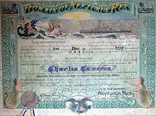 The line-crossing ceremony is an initiation rite that commemorates a person's first crossing of the Equator.[1] The tradition may have originated with ceremonies when passing headlands, and become a "folly" sanctioned as a boost to morale,[2] or have been created as a test for seasoned sailors to ensure their new shipmates were capable of handling long, rough voyages. Equator-crossing ceremonies, typically featuring King Neptune, are common in the Navy and are also sometimes carried out for passengers' entertainment on civilian ocean liners and cruise ships. They are also performed in the merchant navy and aboard sail training ships.