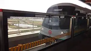 Contrary to other A type trains with 5 doors on each side of a carriage, the Type A (city express) trains on Line 16 only have 3 doors due to the line's more suburban nature. The 16A01 series initially operated in 3 car formations, leading to huge overcrowding issues upon opening. The 16A01 series primarily have transverse seating to suit its more suburban role. With the introduction of the 16A02 series, 16A01 series trains now operate in 3+3 car formations. The 16A02 series trains have more standing room and use more longitudinal seating, which will be able to take 200 more passengers than the 3+3 formation of 16A01.[21] A six carriage train has a capacity of 2,378 passengers, 120% more than trains with three carriages.[22] The tapering of the carbody between cars 3 and 4 where the "blind" cabs of the 3+3 set would be to match the dynamic envelope of a 3+3 set. The 16A02 series offer USB charging.[21]