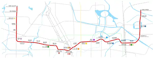 Line 1 of the Zhengzhou Metro (Chinese: 郑州地铁一号线; pinyin: Zhèngzhōu Dìtiě Yī Hào Xiàn) is a rapid transit line running from west to east Zhengzhou. It opened on the 28 December 2013.[1] This line is currently 41.2 km long with 30 stations.[2]
