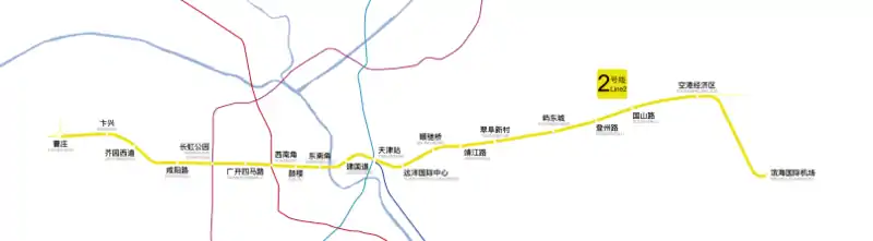 Line 2 of the Tianjin Metro (Chinese: 天津地铁二号线; pinyin: Tiānjīn Dìtiě Èr Hào Xiàn) is a rapid transit line running from west to east Tianjin. Opened on 1 July 2012,[1] the line is 27.157 km long and has 20 stations. It is mostly underground; all stations, with the exception of surface-level station Caozhuang, are underground.