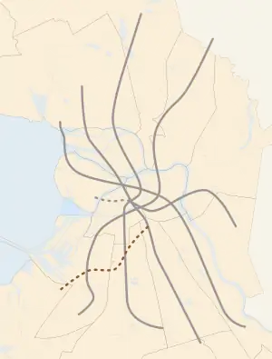 Krasnoselsko-Kalininskaya line (Russian: Красносе́льско-Кали́нинская линия), or simply line 6, is a passenger rapid transit line of the Saint Petersburg Metro system currently under construction. It is identified by the livery colour of brown. Train service is expected to begin in 2022 with 2 stations initially, and 4 more stations inaugurated later in 2026 or 2027. The line lies from Krasnoselsky District, then travels northeastward, with interchange stations allowing passenger transfer with line 1, line 2 and line 5.