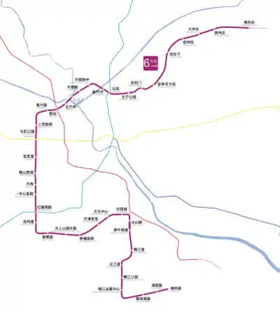 Line 6 of the Tianjin Metro (Chinese: 天津地铁六号线; pinyin: Tiānjīn Dìtiě Liù Hào Xiàn) is a rapid transit line running semi-circular from north-east to south-east Tianjin. It was opened on 6 August 2016.[1] The line was later extended on 31 December 2016 and on 26 April 2018.[2] The line is currently 42.6 km long and has 38 stations. The line currently uses 6 car B size trains but the platform is long enough to support 8 car trains as demand grows in the future. Line 6, together with Line 5 will form a loop around Tianjin.