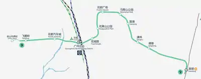 Line 9 of the Guangzhou Metro is expected to run across Huadu District. It will start at Fei'eling and end at Gaozeng, interchanging with Line 3 at Gaozeng. The total length will be 20.1 km (12.5 mi) with 11 stations. Line 9's color is pale green. Line 9 was opened for operation on 28 December 2017.[2]