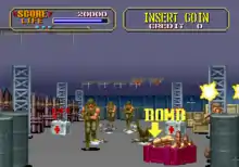The game is played from a first person perspective, with two cabinet mounted, positional guns used the shoot enemies on the screen. There are eight stages which take place in various settings including the enemy base, jungle, desert and ruins.[7] At the end of each is a boss vehicle which must be destroyed to progress. Ammunition is limited to a few clips of bullets for the machine gun, a small supply of hand grenades and a screen clearing missile, although additional supplies can be obtained by shooting the relevant icon when they appear during play.[8]