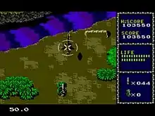 A version was created for the Sega Master System in 1991,[3] published by Sega and developed by Sanritsu Denki. This version is very different from every other conversion as it is an overhead vertically scrolling shooter, although the storyline and locations are mostly unchanged.[12] The game does not feature light gun support, the player using the standard control pad. This game also features support for the SegaScope 3-D Glasses, a way of viewing the game in 3D, if the player enters a button combination when starting up the console with the Line of Fire cartridge inserted.[13]