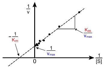 : maximum velocity of the reaction. The y-intercept of the Lineweaver-Burk plot is the reciprocal of maximum velocity, .[2]