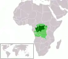 ![]() Geographic distribution of Lingala speakers, showing regions of native speakers (dark green) and other regions of use | |