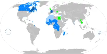 Although not spoken as a first language by most African French speakers, French is a lingua franca in most Western and Central African countries and an official language of many, a remnant of French and Belgian colonialism. These African countries and others are members of the Francophonie.[55] During the 17th century, French replaced Latin as the most important language of diplomacy and international relations (lingua franca). It retained this role until approximately the middle of the 20th century, when it was replaced by English as the United States became the dominant global power following the Second World War.[56][57] Stanley Meisler of the Los Angeles Times said that the fact that the Treaty of Versailles was written in English as well as French was the "first diplomatic blow" against the language.[58]