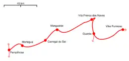 The electrified, mostly single-track, iberian gauge (1,668 m) line runs parallel to the Mondego River.[2] It is the main railway access from Portugal to the rest of Europe.[1] It was constructed by Companhia dos Caminhos de Ferro Portugueses da Beira Alta to open a new international link, closer to Coimbra, and to connect the line to the Port of Figueira da Foz. It was opened on 3 August 1882.[3] During the modernisation and electrification in the 1980s and 90s the signalling and tracks were replaced.[1]