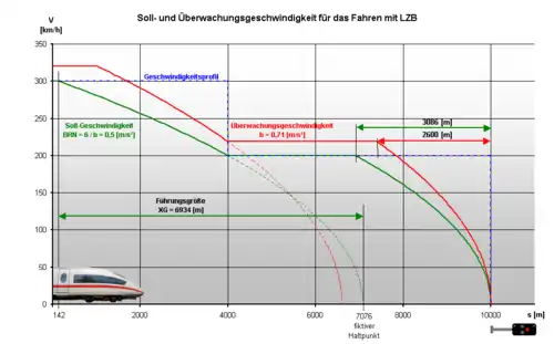 Deceleration rates are more conservative with LZB than with conventional German signalling. A typical passenger train braking curve might have a "permitted speed" deceleration of 0.5 m/s2 (1.6 ft/s2) and a "monitoring speed" deceleration of 0.71 m/s2 (2.3 ft/s2) 42% higher than the deceleration for the permitted speed, but lower than the 0.76 m/s2 (2.5 ft/s2) required to stop from 140 km/h (87 mph) in 1,000 m (3,281 ft) used in conventional signaling. The ICE3, which has a full service braking deceleration of 1.1 m/s2 (3.6 ft/s2) below 160 km/h (99 mph), dropping to 0.65 m/s2 (2.1 ft/s2) by 300 km/h (190 mph), has a LZB target speed deceleration of only 0.68 m/s2 (2.2 ft/s2) to 120 km/h (75 mph), 0.55 m/s2 (1.8 ft/s2) between 120 and 170 km/h (75 and 106 mph), and 0.5 m/s2 (1.6 ft/s2) at higher speeds.[8]