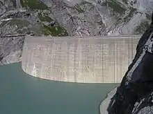 Below Lake Mutt, the main reservoir in the complex is Lake Limmern (Limmernsee), which was created by a 146 m (479 ft) tall and 375 m (1,230 ft) long arch dam on the Limmern Creek. At an elevation of 1,857 m (6,093 ft) above sea level, it can store up to 92,000,000 m3 (74,586 acre⋅ft) of water.[1]