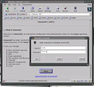Linuxconf is a configurator for the Linux operating system. It features different user interfaces: a text interface, a web interface and a GTK+ interface. Most Linux distributions consider it deprecated compared to other tools such as Webmin, the system-config-* tools on Red Hat Enterprise Linux/Fedora, drakconf on Mandriva, YaST on openSUSE and so on. Linuxconf was deprecated from Red Hat Linux in version 7.1 in April 2001.