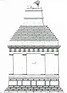 The statue stood on top of a funerary monument that is of a style fashionable in 350 BC in Halikarnassos, a centre that was only a day away by boat. The monument is square with a stepped pyramidal top. It was hollow on a circular plan.[3] This similarity has led to some experts dating the statue to 350 BC, but others think that the statue was above a cenotaph made to commemorate the nearby naval Battle of Cnidus of 394 BC, in which the Athenian general, Conon, commanding a joint Athenian and Persian fleet, was victorious over a Spartan fleet led by Peisander.[4]