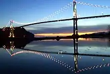 In 1986 the Guinness family, as a gift to Vancouver, purchased decorative lights that make it a distinctive nighttime landmark.[23] In July 2009, the bridge's lighting system was updated with new LED lights to replace its system of 100-watt mercury vapour bulbs. The switch to LEDs was expected to reduce power consumption on the bridge by 90 per cent and save the provincial government about $30,000 a year in energy and maintenance costs.[24]