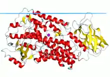 Rabbit 15-lipoxygenase (blue) with inhibitor (yellow) bound in the active site