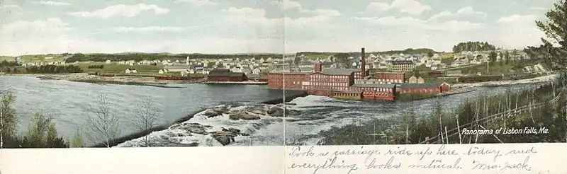 Abenaki Indians called the falls Anmecangin, meaning "much fish". The area was once part of Little River Plantation, a portion of which was incorporated in 1799 as Thompsonborough, then renamed in 1802 after Lisbon, Portugal. In 1806, Lisbon annexed the remainder of Little River Plantation. With water power from the Androscoggin River, Lisbon Falls became a small mill town.[3] Before it burned down in 1987, the Worumbo Mill was the main mill in Lisbon Falls. It had been incorporated in 1864, and was world-famous for its woolens.[4] Especially well known were its vicuna wool products, which became famous when President Eisenhower's Chief of Staff, Sherman Adams, received a vicuna sport coat as a gift from a wealthy industrialist and had to resign due to the resulting scandal. The town's primary employment was at a gypsum mill, which closed in 2009. Another large employer is Bath Iron Works, in nearby Bath, Maine.