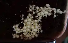 The snails are oviparous and lay shelled eggs.[25] The number of eggs per clutch and clutches per year varies by environment and age of the parent, but averages around 200 eggs per clutch and 5-6 clutches per year. The eggs hatch after 1–17 days and the snails emerge as juveniles. They reach adult size in about six months, after which growth slows, but does not cease until death. Life expectancy is 3–5 years in the wild and 5–6 years in captivity, but the snails can live for up to 10 years.[24]
