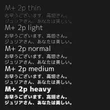 | Heisei Minchō | 平成明朝 | Developed by the Japanese Standards Association (JSA) as a standard typeface for information devices in 1989. It has rather straight edges so that low-resolution printers can output characters with less aliasing. It is distributed by various typeface vendors licensed by the JSA. | |||