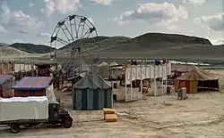 The stops of the carnival throughout the Southwestern United States play a significant part in the show,[10] with many episodes bearing the name of the location of Ben and the carnival. Some stops like Alamogordo, New Mexico are of historical significance; others are fictional. The only episode titled after Brother Justin's location is Season 1's "The River". Both seasons of Carnivàle were filmed in Southern California, with the carnival set being moved to movie ranches and Lancaster. Brother Justin's story in the fictional Mintern, California was shot at Paramount Ranch in Malibu. The permanent filming location of the carnival in Season 2 was Big Sky Ranch, which was also used for Brother Justin's new home in fictional New Canaan. The show's interiors were filmed at Santa Clarita Studios.[11]