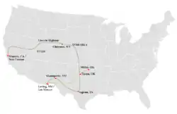 - Streetsign on Ben's route to Cheyenne: "Lincoln Highway – Cheyenne 53 mi. Laramie 91 mi. Rock Springs 250 mi." ("Lincoln Highway").