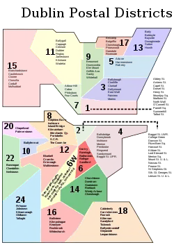 Dublin postal districts have been used by Ireland's postal service, known as An Post, to sort mail in Dublin. The system is similar to that used in cities in Europe and North America until they adopted national postal code systems in the 1960s and 1970s. These were incorporated into a new national postcode system, known as Eircode, which was implemented in 2015.[1][2] Under the Eircode system, the city is covered by the original routing areas D01 to D24, along with A## and K## codes for locations elsewhere in County Dublin.[3]