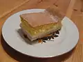 Cake | A cake consisting of three layers: The bottom one is either a yeast dough (Hefeteig) or one made with baking soda (Rührteig), the middle layer is a cream made of quark, vanilla and some butter, egg, sugar and milk, and the top layer is mainly made from eggs (Eier), which are beaten with butter, sugar and "Vanillepudding"-powder (starchy substance normally used to cook a dessert similar to semolina pudding). |