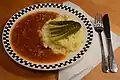 Main course | A dish that consists of mashed potatoes with bouillon and cooked beef. |
