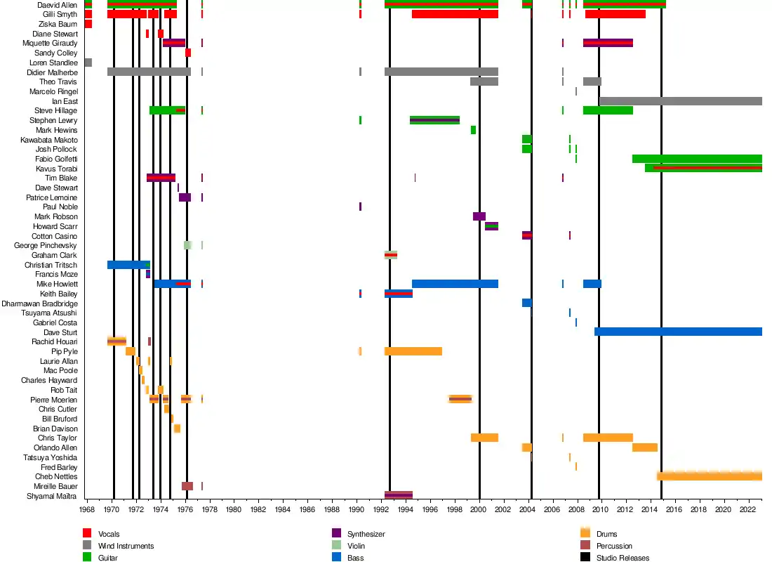 - Daevid Allen – vocals, guitar (1967–1968, 1969-1975, 1977, 1990, 1992–2001, 2003–2004, 2006–2015; died 2015)