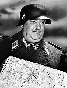 After failing his entrance exams for law or medical school,[5] he received an appointment to a military academy and graduated 95th in his class.[1] Stuck at the rank of colonel for twenty years with an efficiency rating a few points above "miserable", he is the only member of his class still in the Luftwaffe who has not risen to the rank of general. As far as the Wehrmacht knows, no prisoner has ever escaped Stalag 13 during Klink's command, a record he frequently touts. Klink always wears a monocle on his left eye, usually carries a riding crop, and walks with a slight stoop. Klink is for the most part portrayed as a vain, cowardly and muddling, career officer rather than a stereotypical evil German or ardent Nazi. Klink is easily manipulated by Hogan through a combination of flattery, chicanery, and playing on Klink's fear of being sent to the Russian Front or being arrested by the Gestapo.