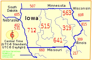 The state of Iowa is covered by five area codes. The map to the right is clickable, click on any of the area codes on the map to go to the area code for that region or use the text links below.