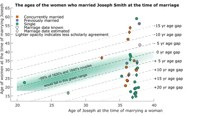 | Fanny Alger | c. 1833–1837 | 16–20 | Yes | Yes | Single | Alger's relationship with Smith was attested to by several people, including Emma Smith, Warren Parish, Oliver Cowdery, and Heber C. Kimball.[19] Several Mormons including Benjamin F. Johnson, Heber C. Kimball and Andrew Jenson, and former Mormons Chauncey Webb and Ann Eliza Webb Young, regarded the relationship as a marriage.[20] Compton cites Mosiah Hancock's handwritten report of his father Levi's account of the marriage ceremony of Smith and Alger, and records his father's account of negotiations between Levi and Smith in procuring their respective wives. Compton also notes that nineteenth-century Historian Lawrence Foster asserts a claim that later Mormons may have falsely assumed there was a marriage where there was only a sexual relationship: he views the marriage of Alger to Smith as a "debatable supposition".[21] As Richard Bushman has noted, Smith "never denied a relationship with Alger, but insisted it was not adulterous. He wanted it on record that he had never confessed to such a sin."[22] After Smith's death, when Alger's brother asked her about her relationship with Smith, she replied, "That is all a matter of my own. And I have nothing to communicate."[23] Brian C. Hales documents three possible timelines for Alger's relationship: the relationship starts in 1832-33 and is shortly discovered; the relationship starts in 1832-33 and isn't discovered until 1835-37; the relationship starts in 1835-37 and is shortly discovered.[24] | ||