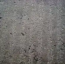 The main source of Khitan texts are monumental inscriptions, mostly comprising memorial tablets buried in the tombs of Khitan nobility.[1] Only one monument in a Khitan script was known before the 20th century, the Record of the Younger Brother of the Emperor of the Great Jin Dynasty (Langjun xingji 郎君行記), which has stood in front of the tomb of Wu Zetian since at least 1618. Until the 1920s it was believed to be written in the Jurchen script. Only after the discovery of the memorial tablets of the Emperor Xingzong of Liao and his consort was it realized that the Record of the Younger Brother of the Emperor and the Liao-dynasty memorial tablets were both written in a Khitan script.[4] Several more memorial tablets in the same script were discovered during the 1930s, including memorials for the Emperor Daozong of Liao and his consort. Initially it was not clear whether the script inscribed on these memorial tablets was the Khitan large script, recorded to have been devised in 920, or the Khitan small script, recorded to have been devised about 925. A different, unknown script, which appeared more similar to Chinese (incorporating many characters borrowed directly from Chinese), had been discovered on a temple monument in 1935, as well as on a memorial to Xiao Xiaozhong in 1951; and in 1962 Jin Guangping suggested that these two monuments were written using the Khitan large script, and that the Record of the Younger Brother of the Emperor and the imperial memorial tablets were written using the Khitan small script.[5] This identification of the two Khitan scripts is now widely accepted.