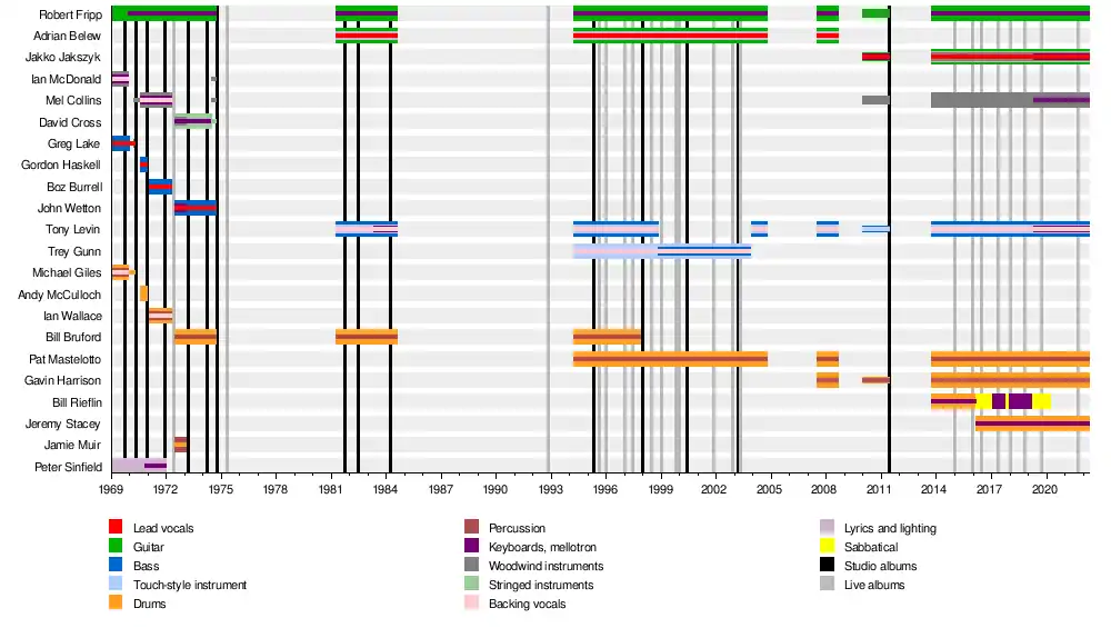 King Crimson are an English progressive rock band from London. Formed in January 1969, the group originally included bassist and vocalist Greg Lake, guitarist and keyboardist Robert Fripp, keyboardist and woodwind musician Ian McDonald, lyricist Peter Sinfield, and drummer Michael Giles. After a number of personnel changes, the group disbanded in 1974 but have since reformed on a number of occasions. As of the latest lineup change in 2020, King Crimson consists of Fripp (the sole constant member of the band), saxophonist and flautist Mel Collins (who first joined in 1970), bassist Tony Levin (who first joined in 1981), drummers Pat Mastelotto (who first joined in 1994) and Gavin Harrison (since 2007), guitarist and vocalist Jakko Jakszyk (since 2013), and drummer and keyboardist Jeremy Stacey (since 2016).