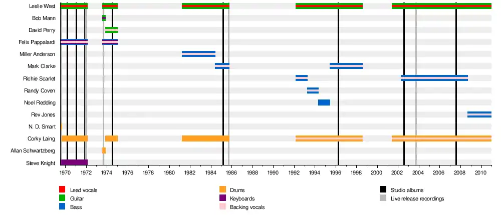 Mountain released Go for Your Life in 1985, which featured new bassist Mark Clarke.[6] Shortly after its release and promotion, the group quietly disbanded again. West and Laing returned as Mountain in 1992, with new bassist Richie Scarlet. After changing personnel again by replacing Scarlet with Randy Coven and later Noel Redding,[8][9] the group released its sixth studio album Man's World in 1996 with a returning Clarke on bass.[10] After another breakup in 1998, Mountain returned in 2001 to record Mystic Fire, which featured session bassist Chuck Hearne alongside West and Laing.[11] For the subsequent touring cycle, Scarlet returned to the band.[12] James "Rev" Jones took over in 2008.[13] West died of cardiac arrest on December 23, 2020.[14]