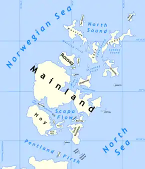 This is a list of Orkney islands in Scotland. The Orkney archipelago is located 16 kilometres (9.9 mi) north of mainland Scotland and comprises over 70 islands and skerries, of which 20 are permanently inhabited. In addition to the Orkney Mainland there are three groups of islands. The North and South Isles lie respectively north and south of Mainland. The Pentland Skerries are a group of small islands in the Pentland Firth, a dangerous stretch of water between mainland Scotland and the larger islands of Orkney, through which run the strongest tidal streams in Britain.[1] The Island of Stroma is often mistakenly included with the Orkney Islands, but is part of Caithness.