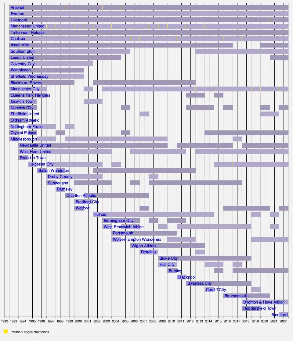 Twelve of the 22 founder members of the Premier League are competing in the 2021–22 season. Six (Arsenal, Chelsea, Everton, Liverpool, Manchester United, and Tottenham Hotspur) have contested every season of the Premier League. The remaining six (Aston Villa, Crystal Palace, Leeds United, Manchester City, Norwich City and Southampton) were also founder members, though each team has been relegated at least once in the past.