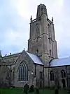 Dates from the 15th century. It has a three-stage embattled tower, supported by buttresses with corner pinnacles, tracery and gargoyles. There is a stone fan vault under the tower. | [28] | |